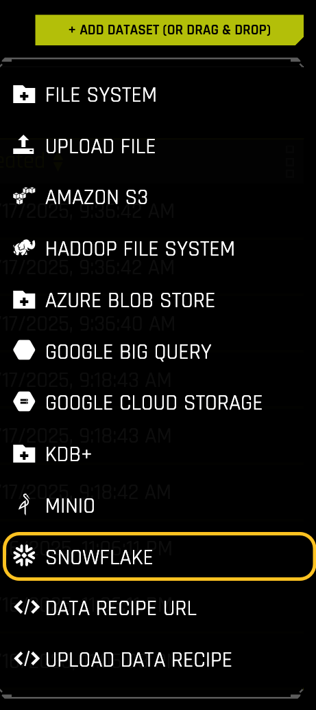 Once your Driverless AI instance is up and running, click + ADD DATASET > SNOWFLAKE.