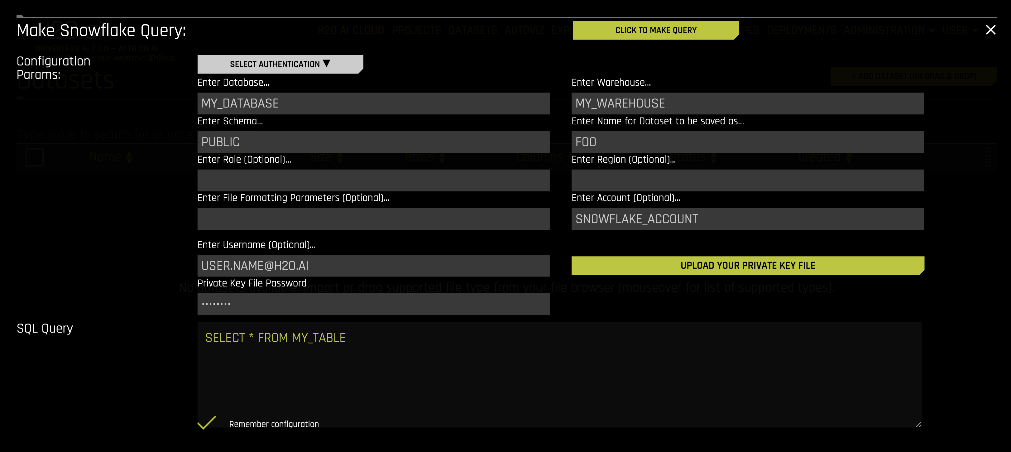 When using SSO authentication with H2O Secure Store, you do not need to enter a username and password when querying Snowflake.